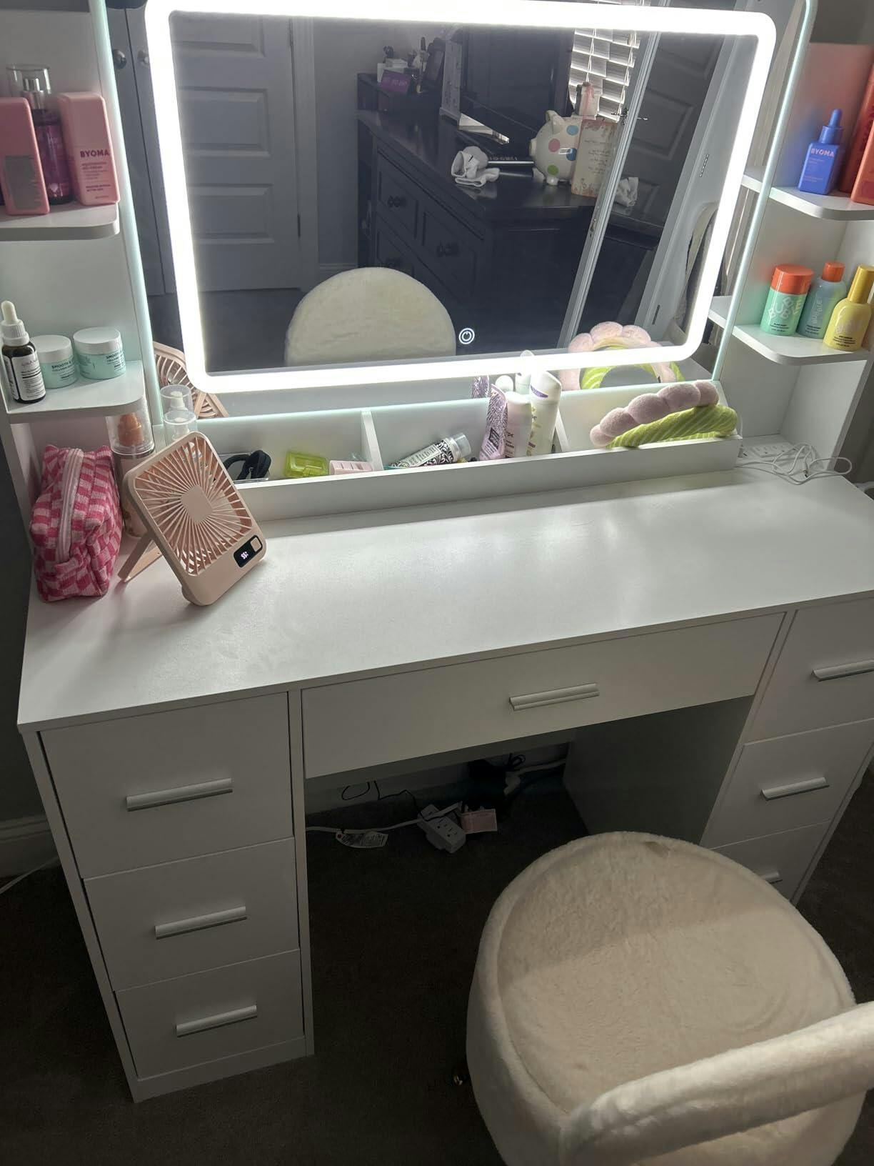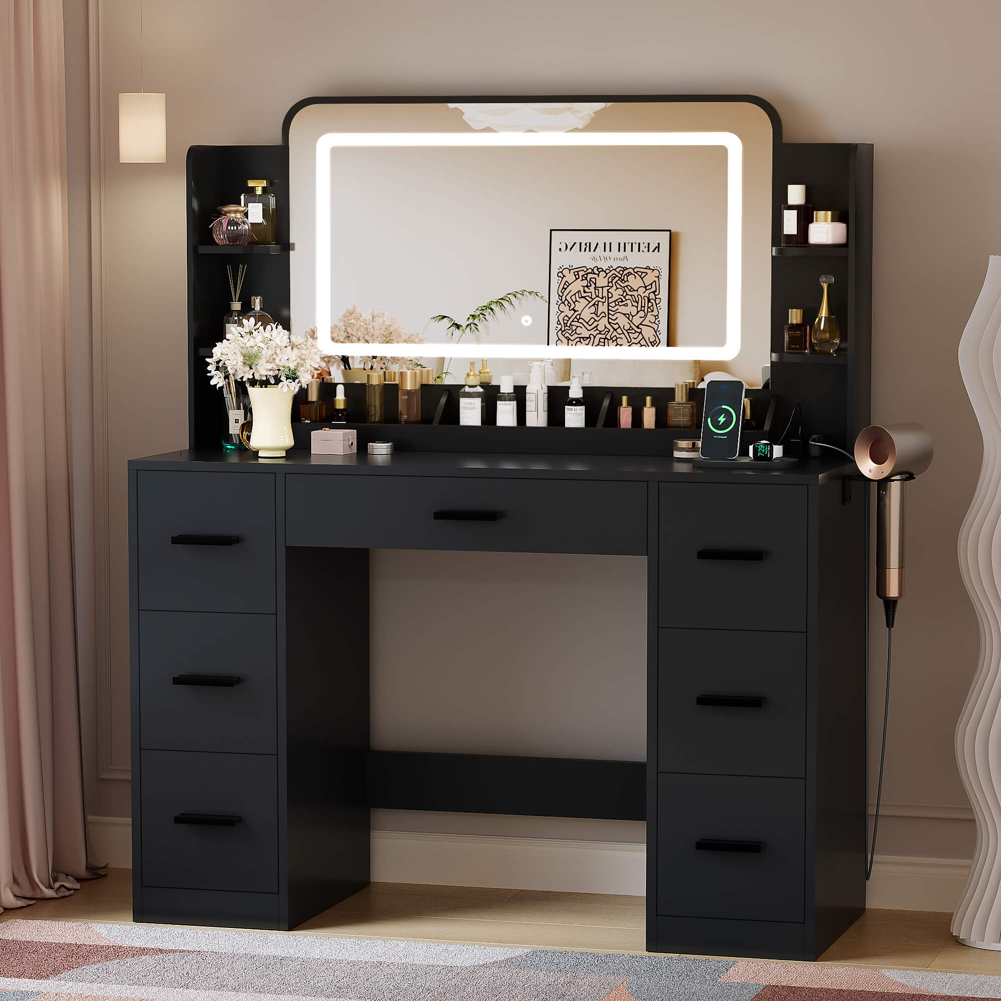 Yes. With its grand 43.3" tabletop, the Aura Vanity is a stunning centerpiece for large suites. Its professional-scale design and 10 LED lights bring boutique-level luxury to any wide-open space.