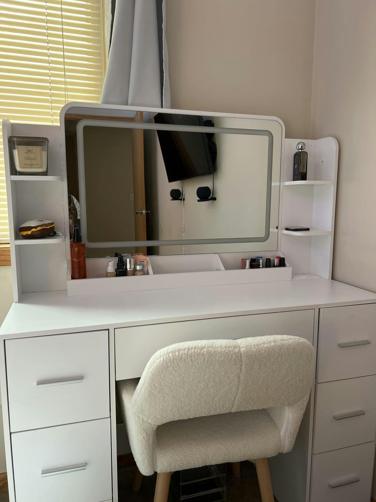 Our makeup vanities are crafted from premium materials including wood frames, high-quality MDF, and tempered glass mirrors. All finishes are non-toxic and meet strict quality standards.